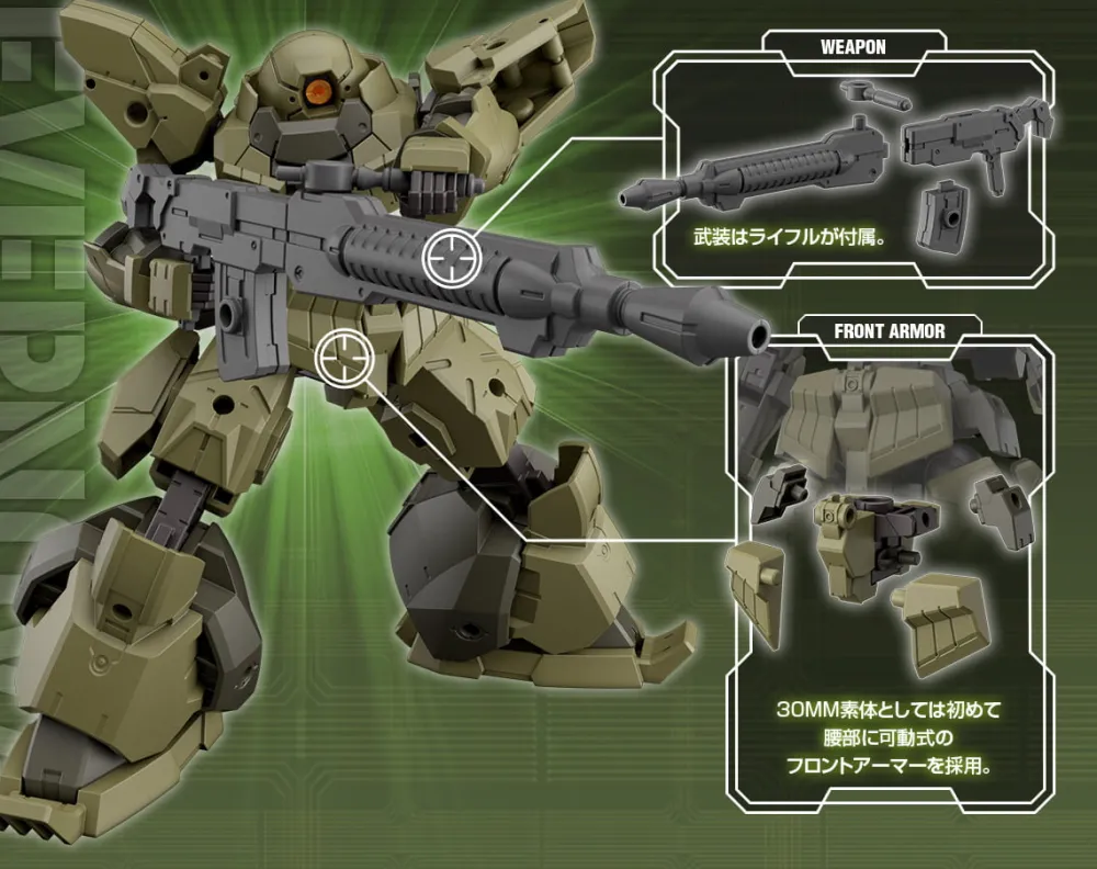 C’est le premier mecha de la série à se combiner ! Ses jambes ont le plus grand volume de l’histoire de 30MM, et c’est aussi le premier élément de 30MM à avoir une armure frontale mobile sur sa taille.