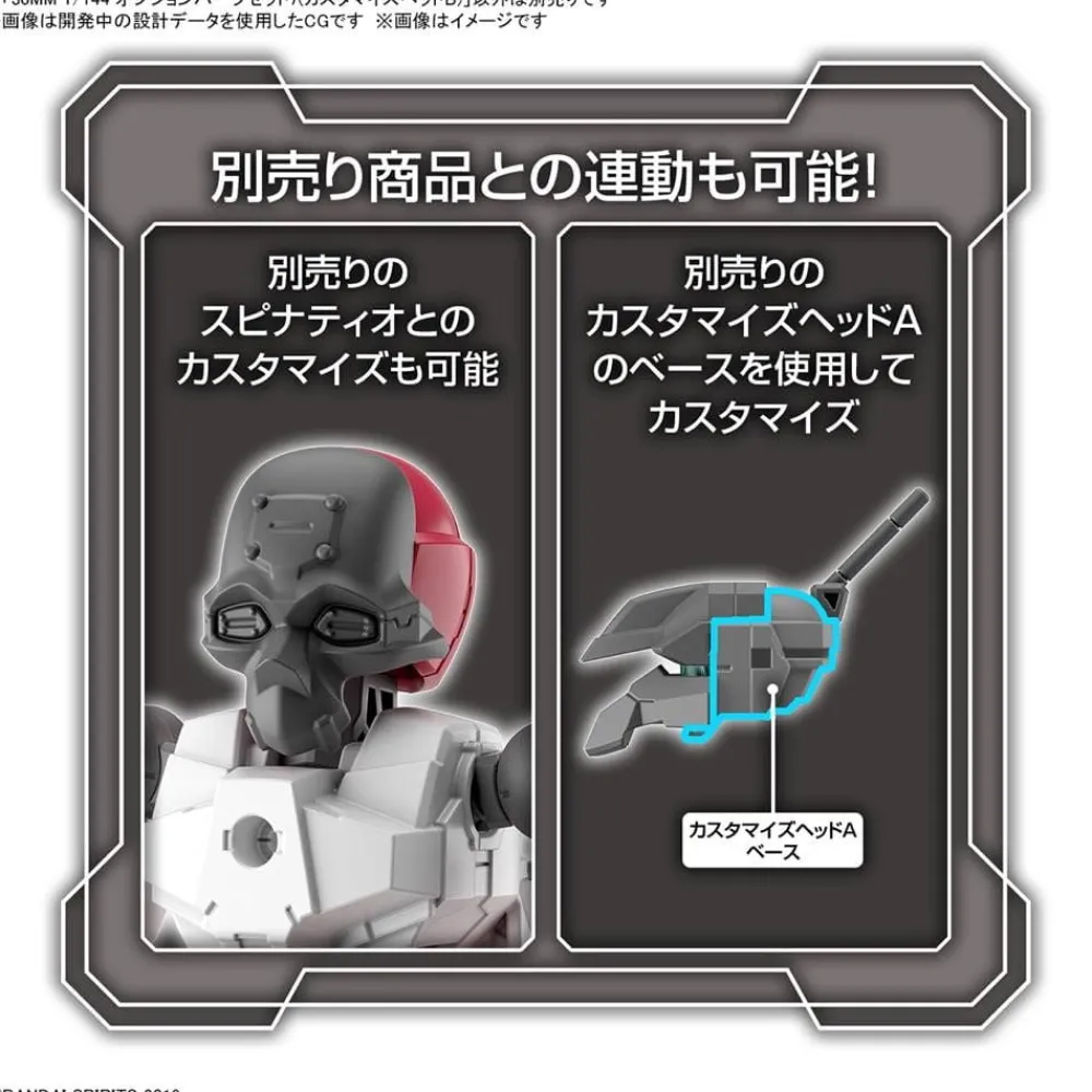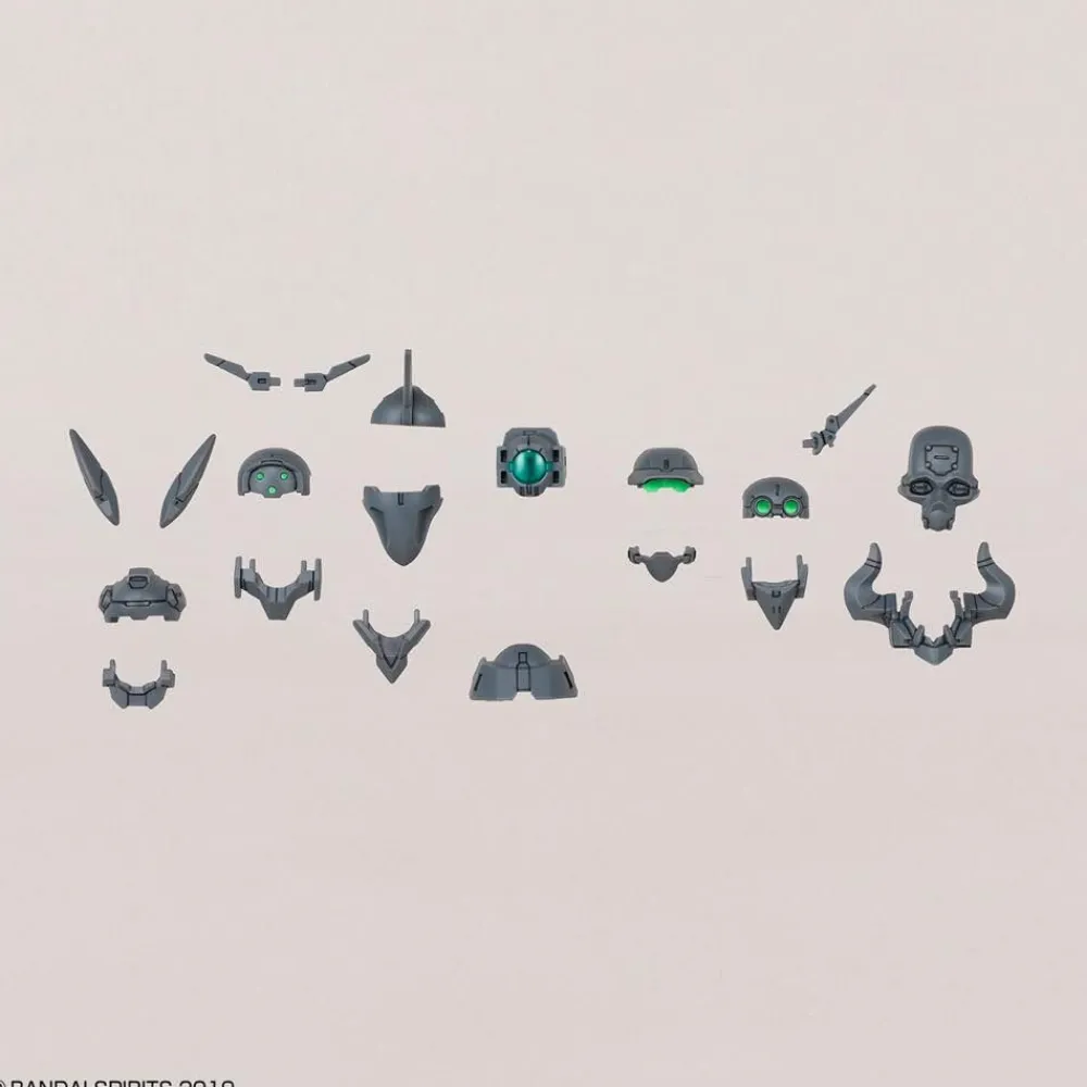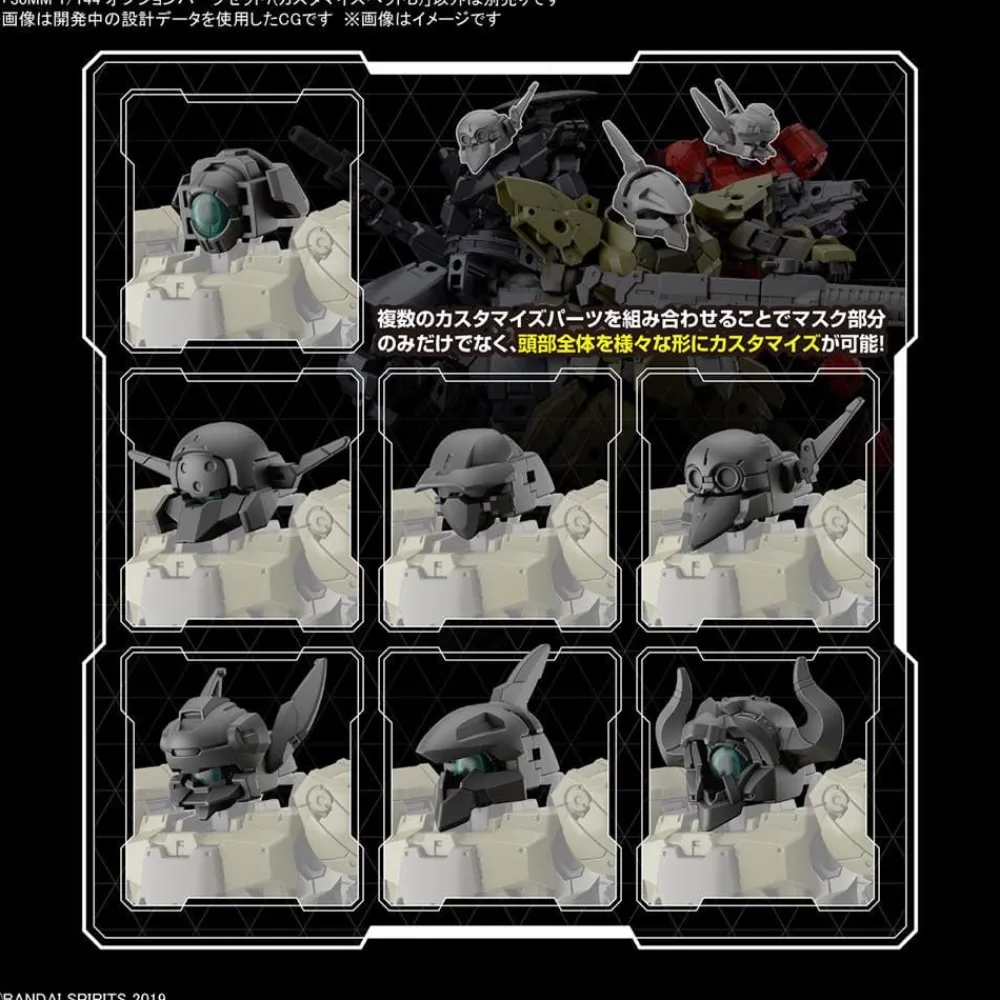 Cet ensemble de pièces pour la tête vous permettra de personnaliser facilement votre mecha 30MM (Thirty Minutes Missions) ! Vous pouvez les combiner et les personnaliser comme vous le souhaitez, que ce soit le masque ou la tête entière ! Le joint personnalisé inclus élargit encore l’éventail des combinaisons possibles. Commandez le vôtre dès aujourd’hui !