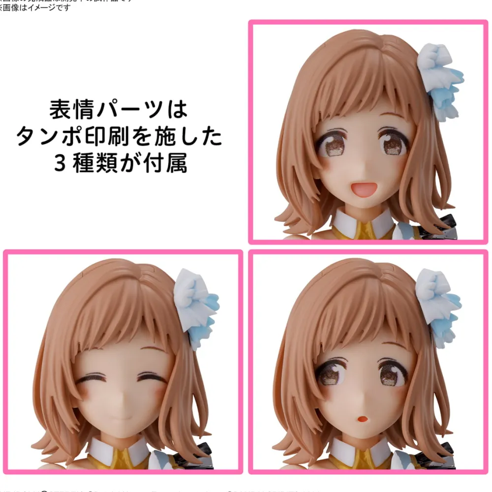 Trois types de pièces d’expression tampographiées sont inclus. La frange peut être reproduite sans ornements de cheveux en échangeant des pièces.