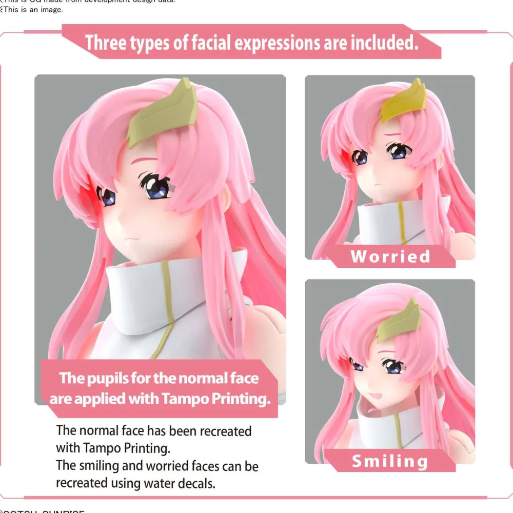 Elle vient avec trois expressions différentes : un visage normal, un visage souriant et un visage troublé. Le visage normal est recréé par tampographie,