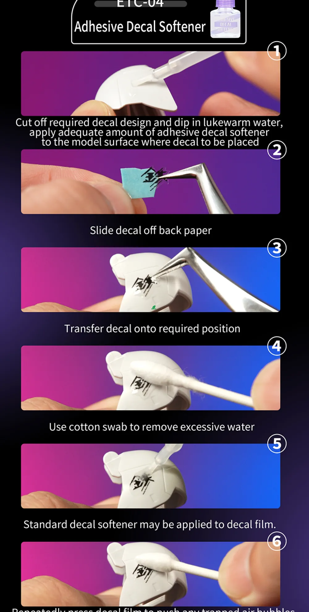 Adhésifs ajoutés à l’assouplissant de décalcomanie standard pour améliorer l’adhérence à la surface du modèle, un must pour les décalcomanies avec un adhésif de qualité inférieure sur les papiers de transport.