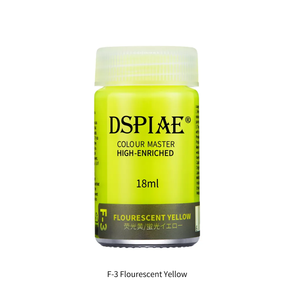 Le pot de la peinture DSPIAE F-3 FLUORESCENT YELLOW 18ml est en verre transparent de haute qualité pour identifier facilement la couleur du produit.