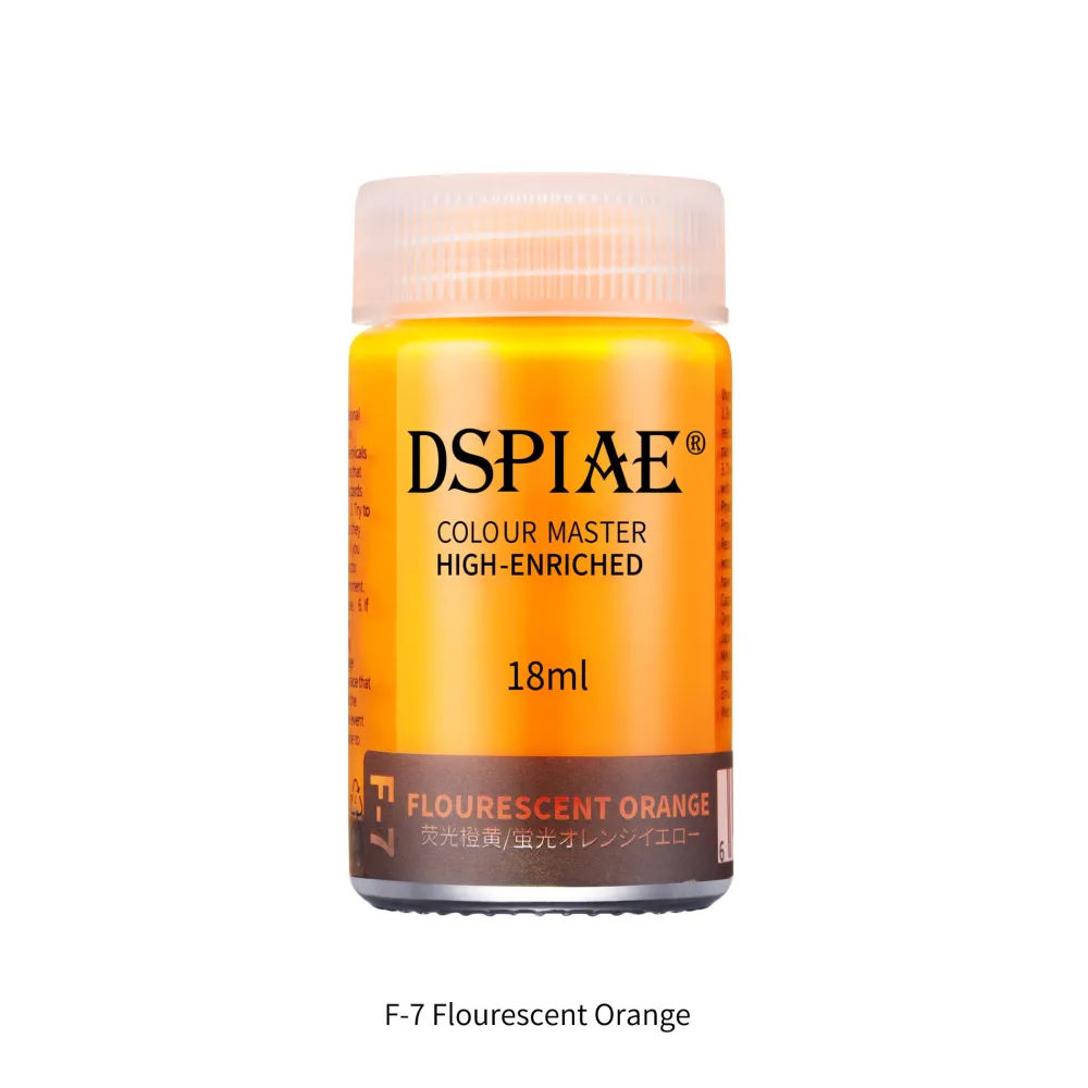 Le pot de la peinture DSPIAE F-7 FLUORESCENT ORANGE 18ml est en verre transparent de haute qualité pour identifier facilement la couleur du produit.