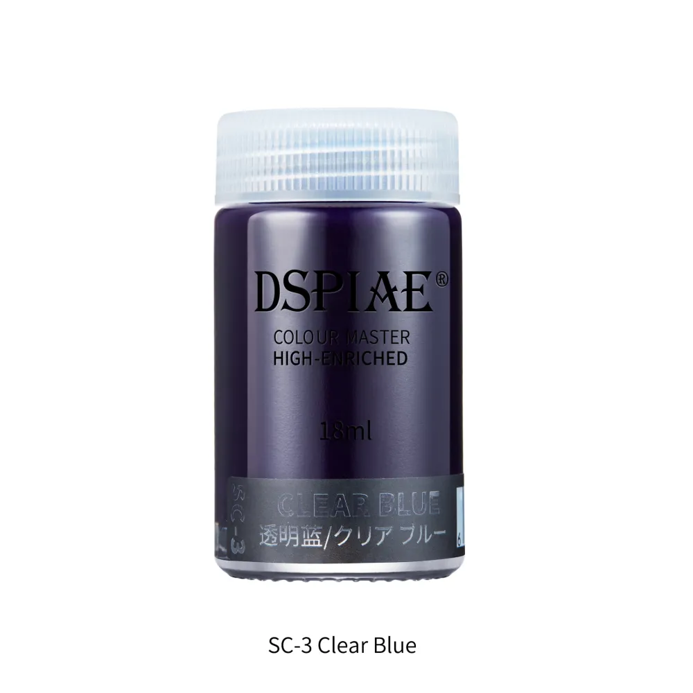 Le pot de la peinture DSPIAE SC-3 CLEAR BLUE 18ml est en verre transparent de haute qualité pour identifier facilement la couleur du produit.
