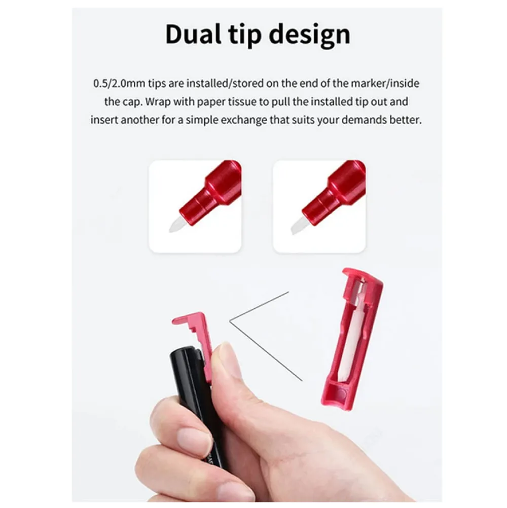 Des pointes de 0,5/2,0 mm sont installées/stockées à l’extrémité du marqueur/à l’intérieur du capuchon.