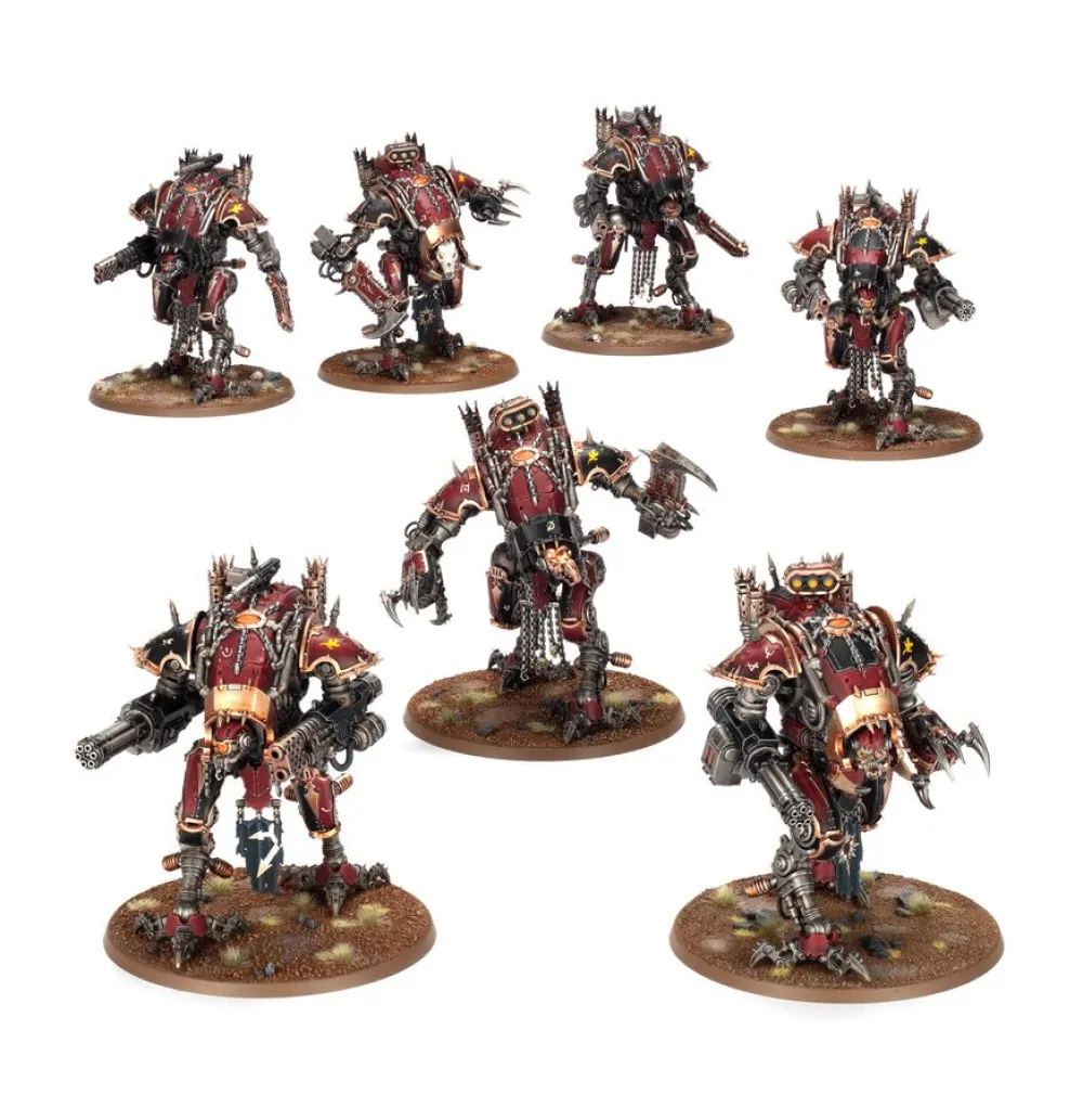 Les Chevaliers du Chaos de classe Dogue agissent en meutes pour leur maisonnée. Pourvus d'un éventail d'armement éclectique, ces marcheurs de combat agiles partent en avant de l'ombre terrible projetée par les Chevaliers plus grands qu'eux, éliminent les éclaireurs ennemis, et protègent les flancs de leurs maîtres colossaux. Ils peuvent se spécialiser dans le combat à distance, dans les mêlées rapprochées, ou un mélange des deux. Alignés en nombre, ils peuvent submerger pratiquement n'importe quel adversaire.Ce kit en plastique permet d'assembler sept Dogues pour vos armées de Chevaliers du Chaos à Warhammer 40,000. Les Dogues peuvent aussi être alignés comme des Affrelames alliés dans vos armées de Space Marines du Chaos, de la Death Guard, d'Emperor's Children, de Thousand Sons ou de World Eaters. Ils peuvent être assemblés afin de former n'importe quelle combinaison de Brigands agressifs, de Karnivores chargés d'armes lourdes ou de Rabatteurs polyvalents, chacun capable de dévaster les unités ennemies et de fournir un soutien redoutable au reste de votre armée. Chaque Dogue peut encore être modifié grâce à toute une variété de poses articulées, de plaques de blindage, de plaques faciales et autres accessoires, ce qui permet de personnaliser facilement vos engins de guerre. Cette boîte pleine est un moyen fantastique de débuter votre collection, ou vous offre beaucoup d'options pour accroître vos forces existantes – et en économisant sur le prix séparé de ces kits.Ce kit permet d'assembler 7 Dogues selon n'importe quelle combinaison des options suivantes:– Dogue Karnivore, armé d'une serre-tronçonneuse Reaper, d'une griffe massacreuse, et d'une mitrailleuse Diabolus– Dogue Brigand, armé d'un canon rotatif Avenger, d'une lance Souffle du Démon, et d'une mitrailleuse Diabolus– Dogue Rabatteur, armé d'un canon rotatif Avenger (pouvant être remplacé par une lance Souffle du Démon), d'une griffe massacreuse (pouvant être remplacée par une serre-tronçonneuse Reaper), et d'une mitrailleuse DiabolusLa mitrailleuse Diabolus de chaque Dogue peut par ailleurs être remplacée par un multi-lanceur Havoc.Ce kit est composé de 770 éléments en plastique, de 7x Socles Ronds Citadel de 100mm et de 4x Planche de Décalcos de Dogues des Chevaliers du Chaos proposant 238 décalcos de grande qualité pour décorer vos figurines.Ces figurines sont fournies non peintes et nécessitent assemblage – nous recommandons d'employer la Colle Plastique Citadel et la peinture Citadel Colour.Les figurines de cette boîte sont aussi disponibles séparément. Informations complémentaires