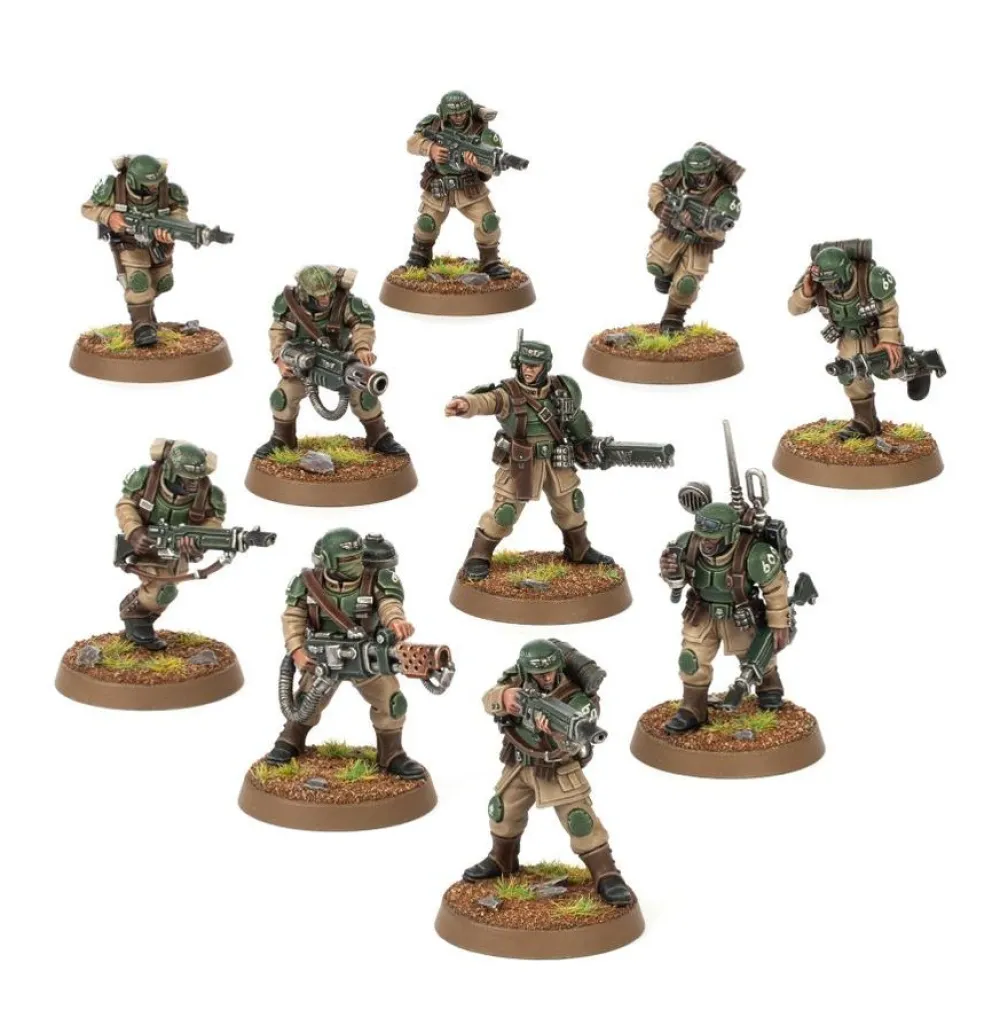 Soldats nés, les Troupes de Choc de Cadia commencent leur formation militaire dès qu'elles ont l'âge de tenir un fusil. De longues années d'entraînement font d'eux des tireurs d'élite, doués à la fois pour les défenses tenaces et les assauts éclair. Les Troupes de Choc Cadiennes sont considérées par beaucoup comme les soldats impériaux idéaux, d'innombrables régiments étant forgés à leur image.Ce kit plastique permet d'assembler 10 Troupes de Choc Cadiennes, le noyau de nombreux régiments de l'Astra Militarum. Chaque Soldat de Choc est armé de grenades Frag et d'un loyal fusil laser. Ils sont menés par un Sergent équipé d'un fusil d’assaut à chargeur tambour ou d'une épée tronçonneuse complétée soit par un pistolet laser, soit par un pistolet bolter. Ce kit contient également un choix d'armes spéciales pour équiper vos Troupes de Choc, du lance-flammes au lance-grenades en passant par le fuseur et le fusil à plasma, ainsi qu'un émetteur vox pour les communications sur le champ de bataille.Vous trouverez également toutes sortes d'options esthétiques pour garantir que vous n'aurez pas deux escouades identiques, grâce à des poses variées, plus de 20 têtes différentes, des sacs de sable, des couteaux de combat, une bêche, un casque en surplus et plein de sacs de couchage.Ce kit est composé de 131 éléments en plastique et est fourni avec 10x socles ronds Citadel de 25 mm. Il contient également une Planche de Décalcomanies d'Infanterie de l'Astra Militarum avec 597 décalcos proposant des numéros, des marquages d'escouade et l'héraldique régimentaire cadienne. Ces figurines sont fournies non peintes et nécessitent assemblage – nous recommandons d'employer la Colle Plastique Citadel et la peinture Citadel.