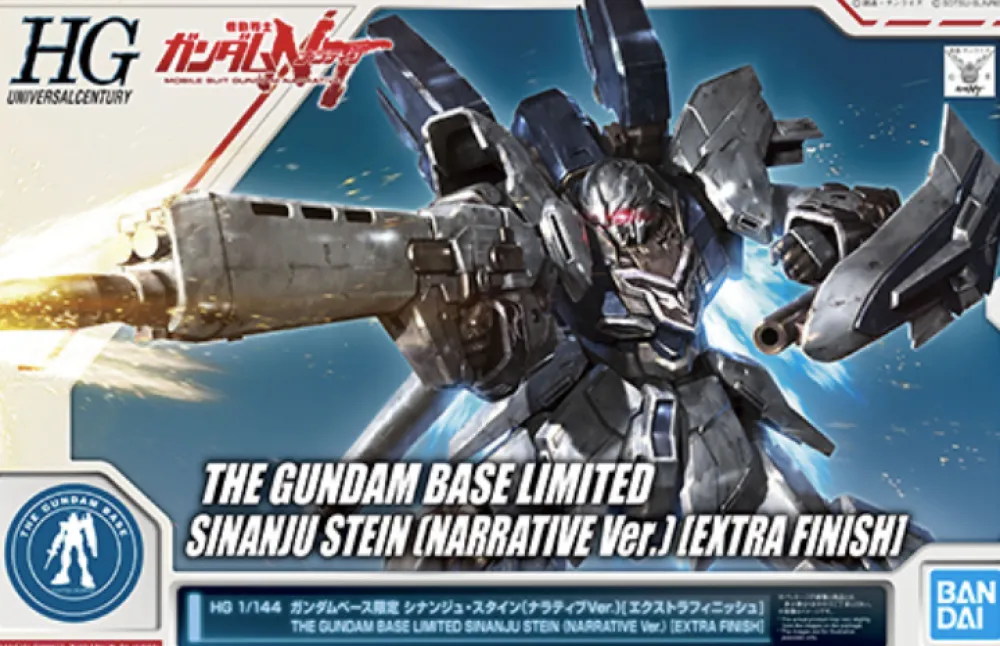 Le HGUC SINANJU STEIN (NARRATIVE VER.) [EXTRA FINISH] THE GUNDAM BASE LIMITED est un kit à l'échelle 1/144 sorti en 2019 en exclusivité pour The Gundam Base.Ce dernier comprend : Le Hg Sinanju Stein avec deux beam sabers, des mains, une paire de support d'armes polyvalents, une main gauche ouverte et main droite pour gâchette, un beam riffle et son lance grenade, un bouclier ainsi qu'un bazooka. Un Museau supplémentaire (à combiner avec le HBR) est également fourni.Caractéristiques du kit et gadgetsArticulation :