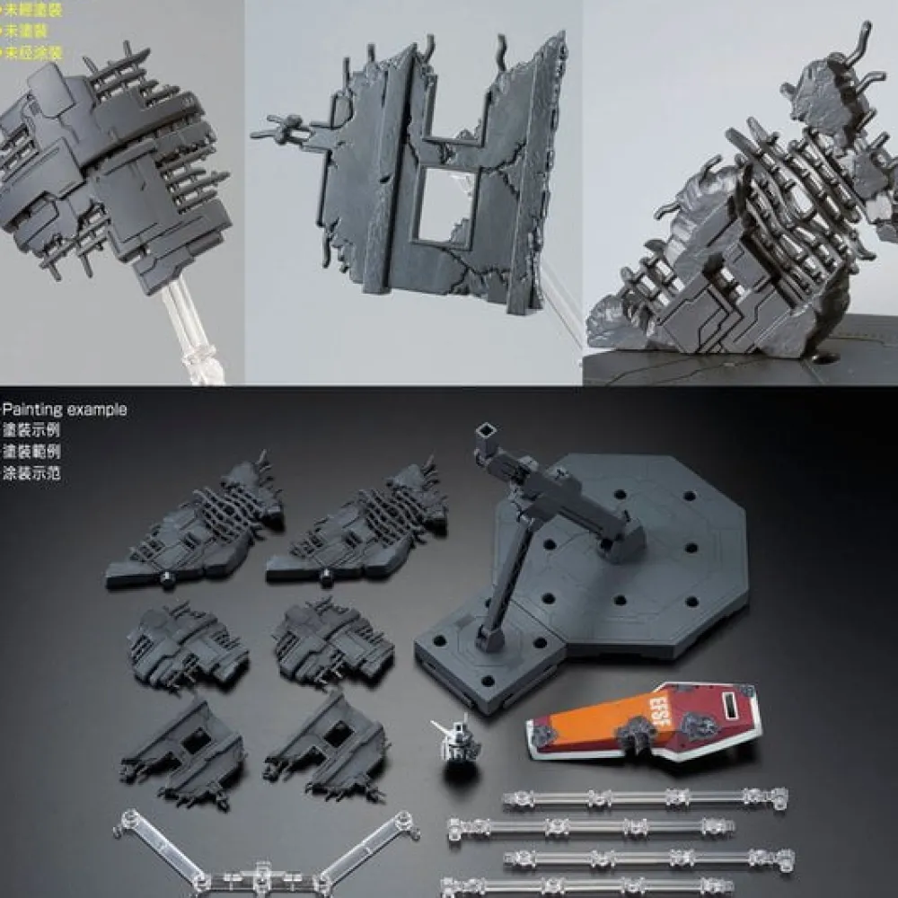 Trois types de pièces de débris sont nouvellement inclus, basés sur l’image de la colonie endommagée où la bataille finale a eu lieu. Comprend un bras de présentation à fixer, permettant la reproduction d’une variété d’affichages.
