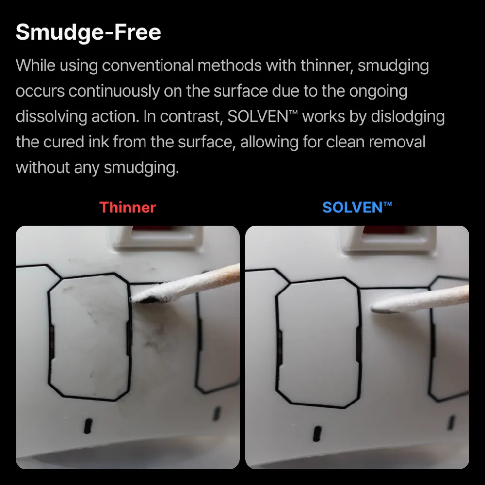 SOLVEN™ est une solution incolore et inodore spécialement formulée pour le nettoyage des panel lines. Contrairement aux diluants enamel traditionnels, qui laissent souvent des traces en raison de leur action de dissolution continue, SOLVEN™ élimine efficacement l’encre durcie sans bavures, assurant une finition propre à chaque fois. Sa puissance de dissolution équilibrée permet un nettoyage rapide des taches d’encre, éliminant les longs temps de séchage associés aux diluants classiques.