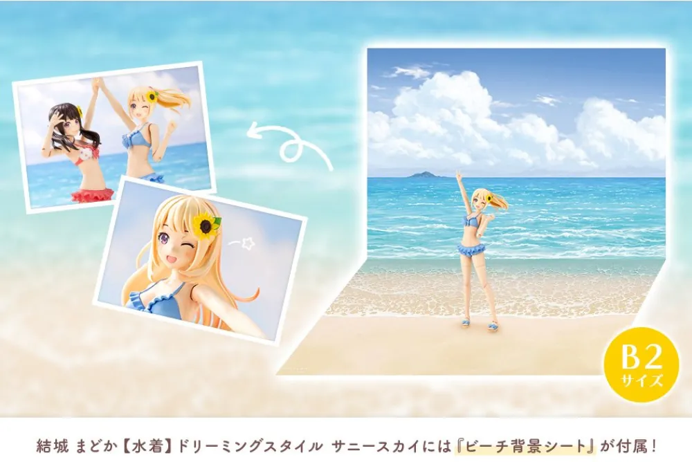 Ce kit comprend une feuille de fond de scène spécialement illustrée (format B2) représentant la plage pendant l’été ! L’utilisation de cette toile de fond rendra la prise de photos beaucoup plus amusante et les utilisateurs voudront alors certainement exposer Madoka avec les prochains modèles Koyomi et Ritsuka de style natation !