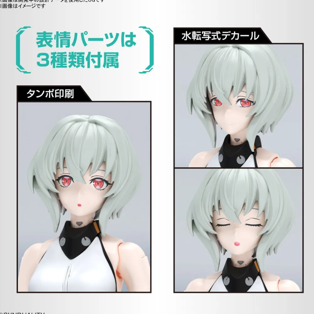 ■ Trois types de pièces d’expression faciale sont inclus, et les expressions faciales du personnage sont délicatement exprimées avec des décalcomanies d’impression tampographique et de water decals