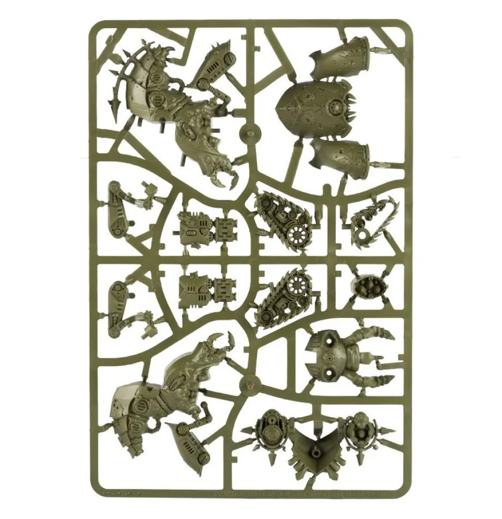 Propulsé au combat sur ses trois trains de chenilles articulés, le Myphitic Blight-hauler est une machine-démon légère qui fournit à la Death Guard l'appui-feu partout où elle en a besoin. Ressemblant à un Bloat-drone privé de turbines, cette étrange machine a des armes lourdes montées sur la carapace, et ses plaques de blindage peuvent absorber des dégâts considérables – tout comme ses replis de chair exposés, capables d'endurer des traumatismes majeurs. Le Myphitic Blight-hauler est une combinaison repoussante de machine et de viande pourrie. Vu de devant, il évoque quelque engin blindé grotesque, avec une carapace bombée frappée du symbole de Nurgle, etune paire de chenilles carénées. Mais ce qui le distingue d’un véhicule de combat ordinaire, c’est la gueule garnie de crocs à sa base. Vu de derrière, l’horreur continue – une troisième chenille côtoie une masse de chair molle sanglée à la machine. Le Myphitic Blight-hauler est armé d’un multi-fuseur et d’un lance-missiles, montés sur les flancs de sa carapace.