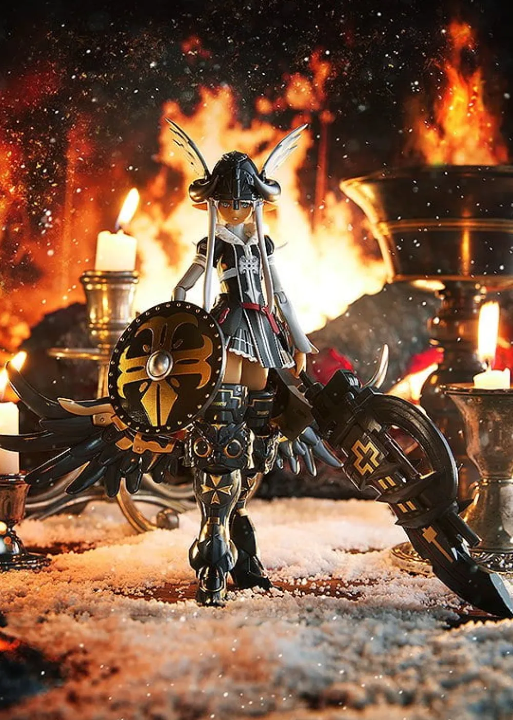 Trois visages pré-peints – un visage standard, un visage criant et un visage rougissant – sont inclus. Une plaque faciale non peinte et des décalcomanies pour les yeux sont également incluses. Son tablier au design unique est créé avec des pièces en PVC prépeintes. Cette fois, la jupe est réalisée avec des pièces en PS prépeintes, et des décalcomanies peuvent être appliquées sur le jabot et les parties principales pour reproduire l’aspect de l’illustration originale. Sa jupe est également articulée, permettant un mouvement libre de ses jambes pour la pose. Sa grande hache peut être transformée en une grande épée. Le modèle est livré avec un bouclier, une unité de fixation à la taille, deux haches et une épée courte. Il peut également être exposé sans aucun équipement. Les parties des mains sont réalisées en PVC souple. Un support articulé est inclus pour présenter le modèle dans une variété de poses.