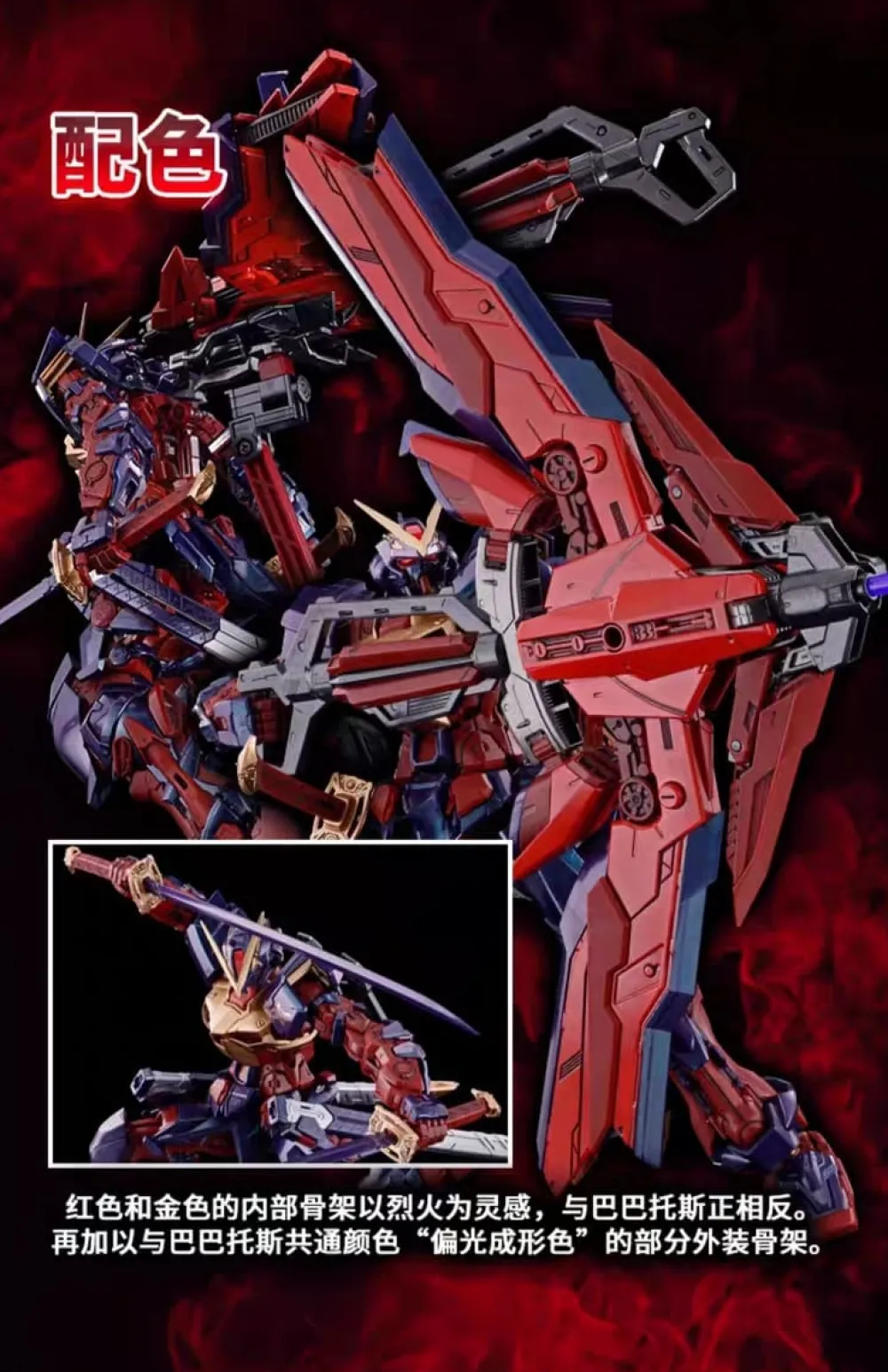 Le Gundam Astray Red Frame Kai fait partie d’une collection spéciale comprenant également le MG 1/100 Gundam Barbatos, revisité dans une version Cross Contrast Color. Ce thème met en avant des schémas de couleurs contrastés entre ces deux mobile suits emblématiques, créant un effet visuel saisissant et une opposition thématique marquante. Le Gundam Astray, avec ses tons sombres et dorés, complète parfaitement le Gundam Barbatos modernisé, offrant une combinaison visuellement spectaculaire pour les collectionneurs et les fans de la série.