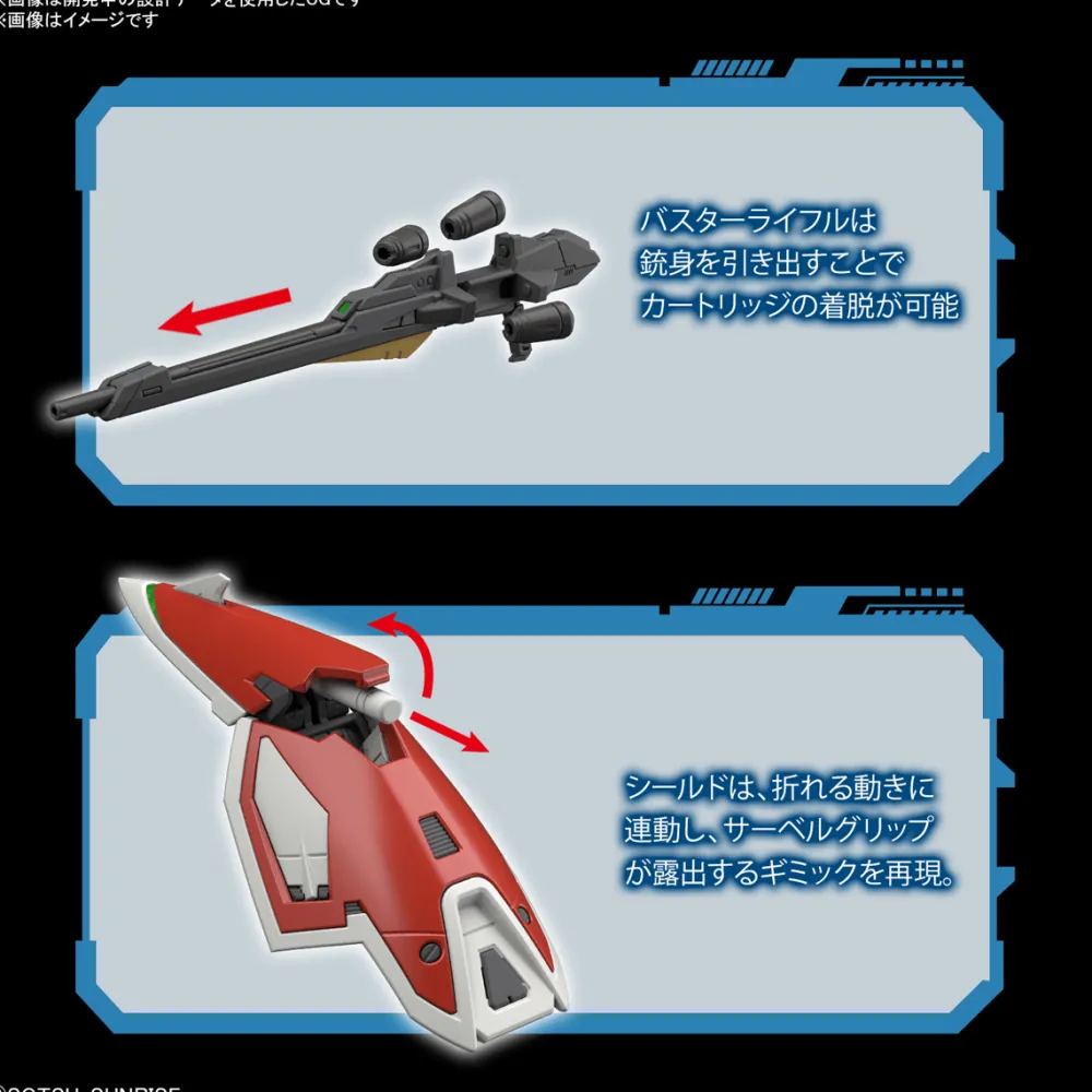 Sur l’épaule, pour reproduire la position dynamique du fusil buster et du sabre à poutre, le gadget mobile est intégré dans le bloc corporel.