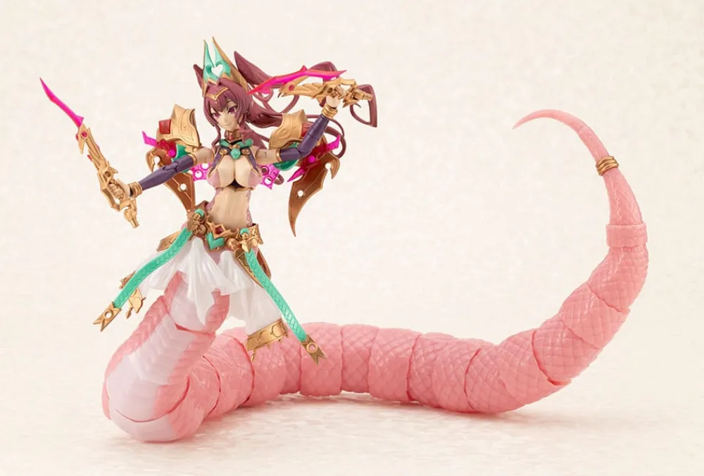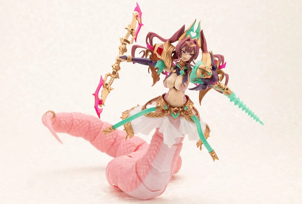 Le tout nouveau membre de la série de modèles plastiques de musume à thème SF/fantasy "Arcanadea" de Kotobukiya est Meltina, une Dears de type Lamia avec un corps inférieur serpentin ! Ce modèle est basé sur une illustration du célèbre artiste Zton, actif dans divers domaines comme les anime, les mangas et les jeux.Assemblez les pièces dédiées à chaque forme pour recréer l'un des deux modes : le mode "normal" (non-combattant) et le mode "Willise" (état de combat) !Quatre expressions faciales interchangeables avec tampographie sont incluses, ainsi que des décalcomanies pour personnaliser ses expressions.Ses oreilles peuvent être remplacées par celles d'autres Dears.Des pièces de cou sont fournies pour connecter sa tête aux figurines Frame Arms Girl et Megami Device.Deux supports sont inclus pour l'exposition.Six paires de mains en PVC, toutes nouvelles, sont également fournies.Ses bras supérieurs ont des articulations doubles pour une grande variété de poses, et son corps serpentin est doté de joints à rotule sur chaque segment pour une mobilité ultra-flexible !Le joint reliant son corps supérieur et inférieur est compatible avec Arcanadea Elena.Si vous achetez plusieurs exemplaires de ce kit, vous pourrez allonger encore plus les parties serpentines du bas du corps ![Mode Normal]Un familier en forme de chauve-souris est inclus, ainsi qu'une dague décorative que Meltina peut tenir.La base de ses cheveux à l'arrière de la tête est articulée pour ne pas gêner ses poses.La draperie décorative sur sa ceinture est fixée à une tige de 3mm et une rotule de 3mm pour plus de variété dans les poses.La partie cercle magique dans son dos est un joint hexagonal avec un trou de 3mm au centre pour une tenue stable. Compatible aussi avec les joints de la série Hexa Gear ![Mode Willise]Réarrangez l'accessoire capillaire et l'armement du familier chauve-souris pour recréer sa silhouette caractéristique !Un bâton en forme de cobra est inclus comme arme principale, utilisable en bâton ou en fouet en changeant les pièces.Deux multi-lames avec lames transformables sont aussi fournies ; elles peuvent devenir une épée double tranchant en les combinant avec des pièces spéciales.Le fouet en cobra a une mâchoire mobile, et peut tenir l'épée en la mordant. Il peut aussi être combiné avec le familier chauve-souris.Le familier chauve-souris inclut une pièce interchangeable avec des yeux divergents pour des scènes comiques !Commandez-la dès aujourd'hui pour votre collection !