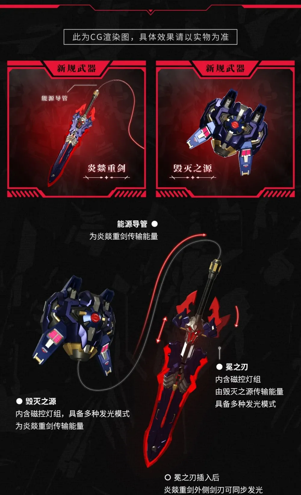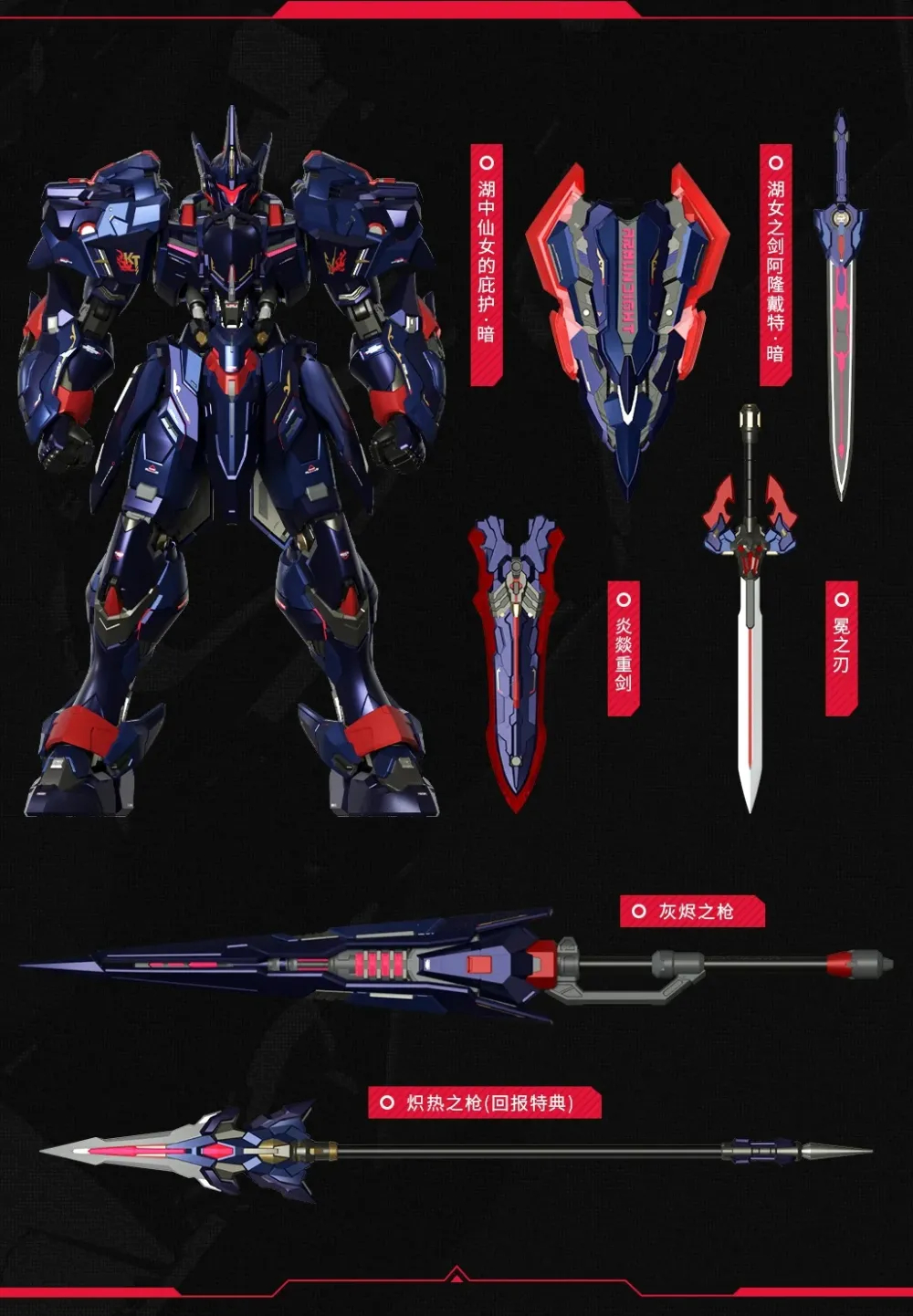 Contenu :– 1 x Corps principal– 1 x Épée lourde Yan Yi (incluant la lame Crown Blade)– 1 x Connecteur d'épée lourde Yan Yi– 1 x Source de Destruction– 1 x Conduit d'énergie– 1 x Lance de Cendres (Ash Spear)– 1 x Bâton d'arme pour lance longue– 1 x Protection de la Dame du Lac · Obscure– 1 x Épée de la Dame du Lac Arondight · Obscure– 1 x Pièce d'effet de coiffure– 6 x Paires de mains (dont une paire de poings serrés fournie avec le corps principal)– 1 x Ensemble d'éclairage pour la tête– 2 x Ensembles d'éclairage pour épaules– 1 x Ensemble d'éclairage pour la Source de Destruction– 1 x Ensemble d'éclairage pour la Crown Blade– 2 x Connecteurs– 1 x Plaque magnétique pour nom– 2 x Supports d'armes– 1 x Base métallique et support– 1 x Carte de garantie (contient le code S/N d'enregistrement du produit ) Le code S/N est la preuve après-vente du produit, veuillez faire attention à le conserver et ne pas le jeter !
