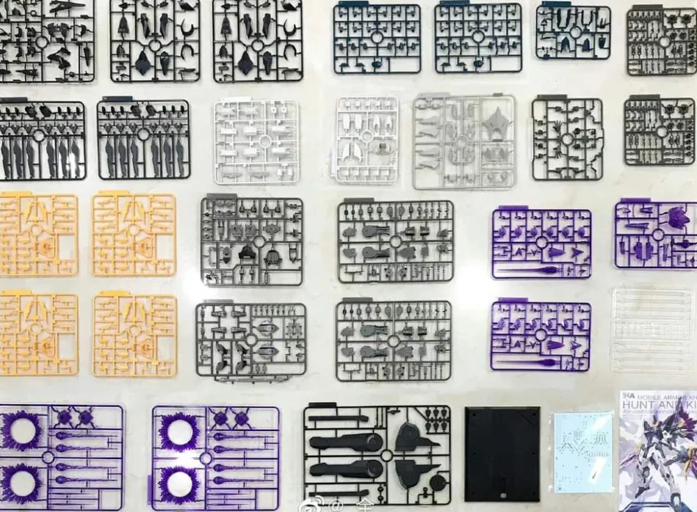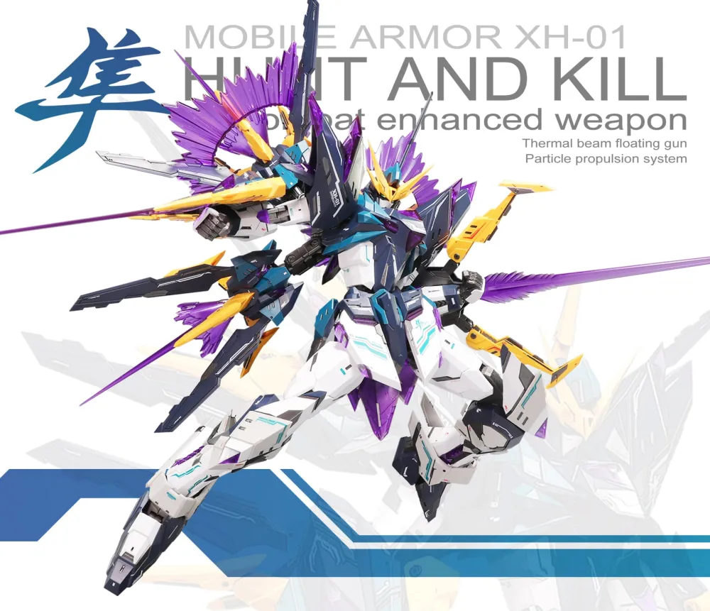 Le Mobile Armor XH-01 Hunting Falcon – Hunt and Kill (SNAA) est une maquette en plastique à construire sans colle. Il possède un squelette interne en plastique et des décalcomanies à eau, un stand, des pièces d’effets violets pour le « canon flottant » et un support pour ce dernier (bonus spécial de précommande).